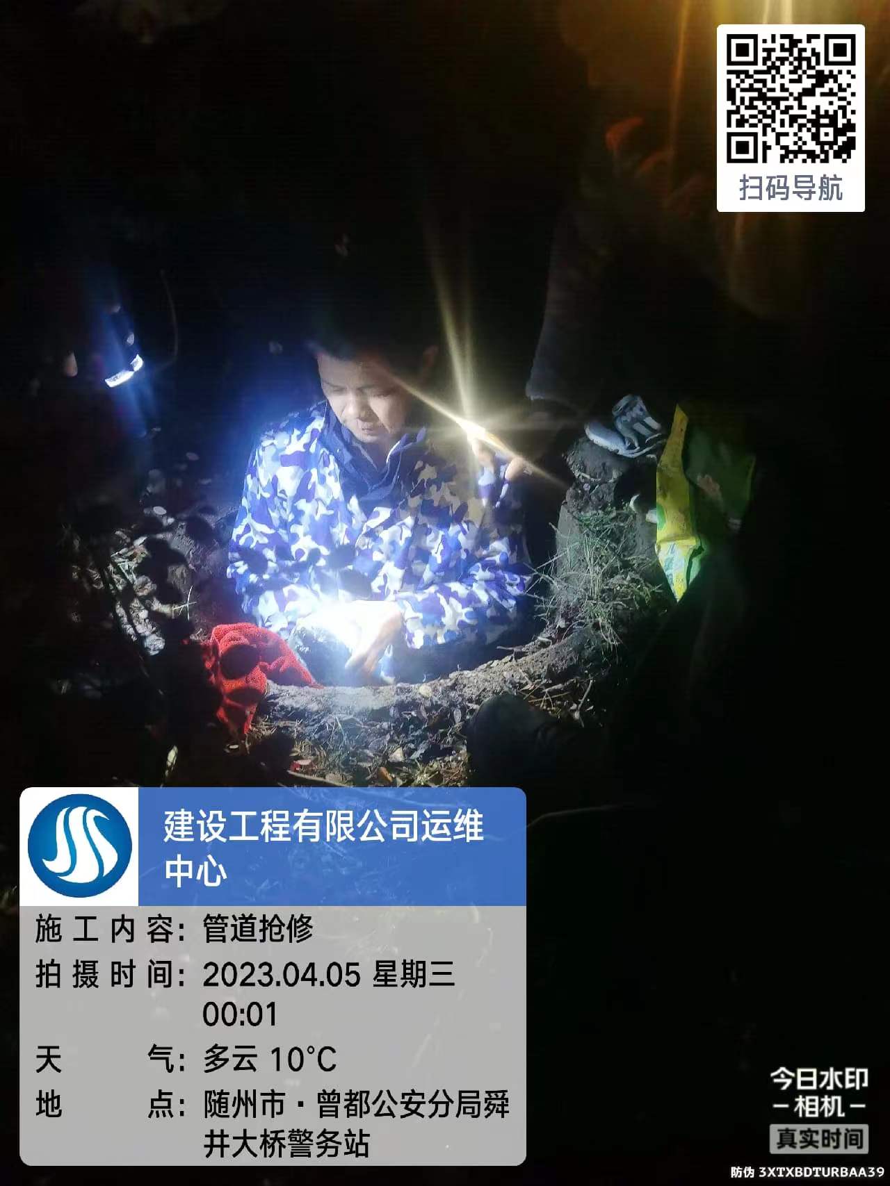夜幕里,在探照燈燈光的照射下,為盡快修復供水管道,縮短停水時間,敲、拆、補、焊、聽......搶修隊伍一刻不停,緊張地忙碌著。夜晚春風微涼,他們的衣服被汗水浸透卻也渾然不覺。經(jīng)過連續(xù)3個多小時的奮戰(zhàn),搶修人員終于在翌日凌晨三點半順利修復了破損管道,恢復了通水,圓滿完成了搶修任務!