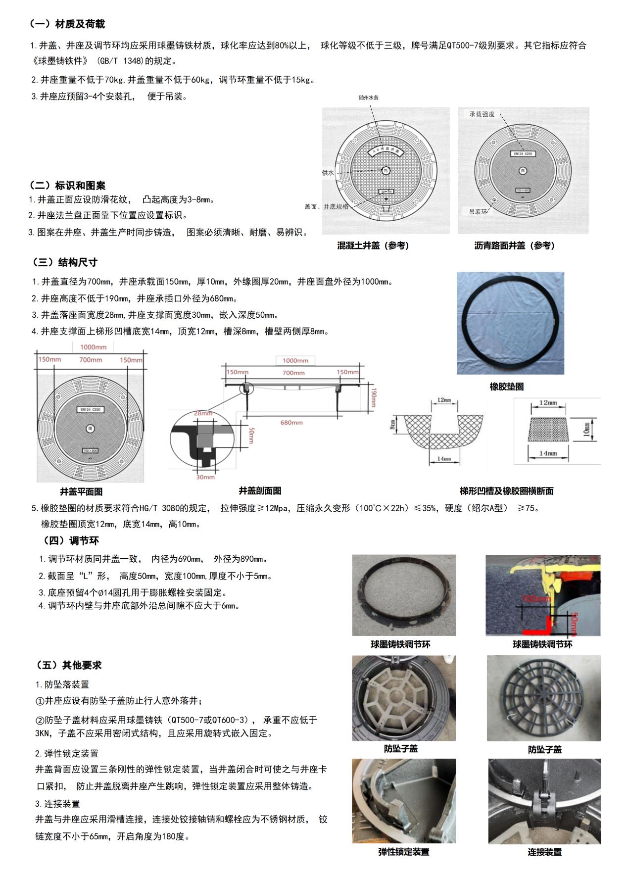 2、井蓋正面應(yīng)設(shè)防滑花紋,凸起高度為3-8mm;井座應(yīng)設(shè)有防墜子蓋防止行人意外落井防墜子蓋材料應(yīng)采用球墨鑄鐵(QT500-7或QT600-3),承重不應(yīng)低于3KN,子蓋不應(yīng)采用密閉式結(jié)構(gòu),且應(yīng)采用旋轉(zhuǎn)式嵌入固定。井座重量不低于70kg,井蓋重量不低于60kg,調(diào)節(jié)環(huán)重量不低于15kg(具體規(guī)格型號(hào)參照附件5);