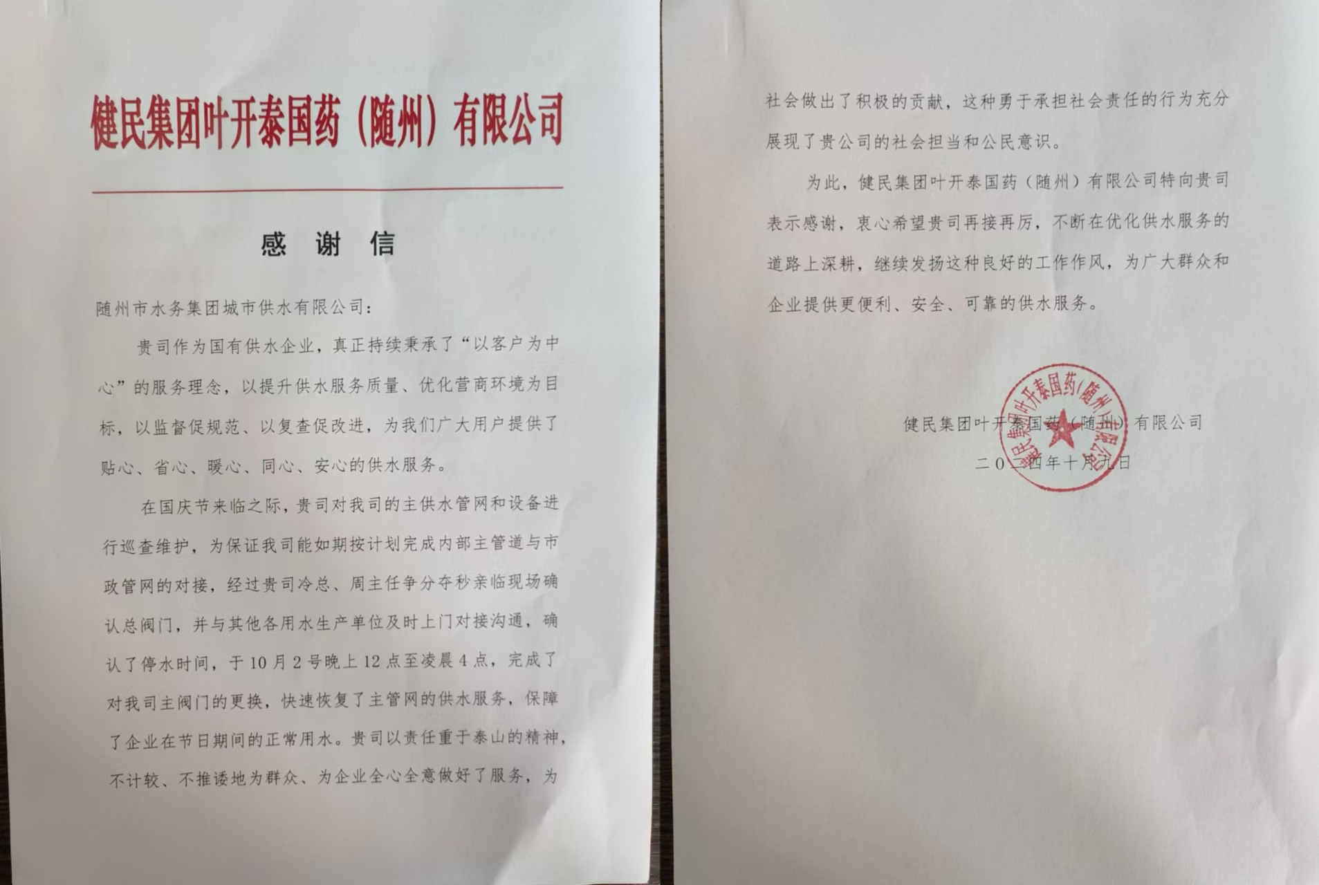 “排憂(yōu)解難及時(shí) 供水服務(wù)周到”,近日,健民集團(tuán)葉開(kāi)泰國(guó)藥(隨州)有限公司專(zhuān)程到隨州市水務(wù)集團(tuán)下屬子公司城市供水有限公司送上一面承載誠(chéng)摯謝意的錦旗和一封感謝信,他們用最質(zhì)樸、最真摯的方式,對(duì)公司運(yùn)維人員熱情、高效、便捷、暖心的服務(wù)表示誠(chéng)摯感謝。