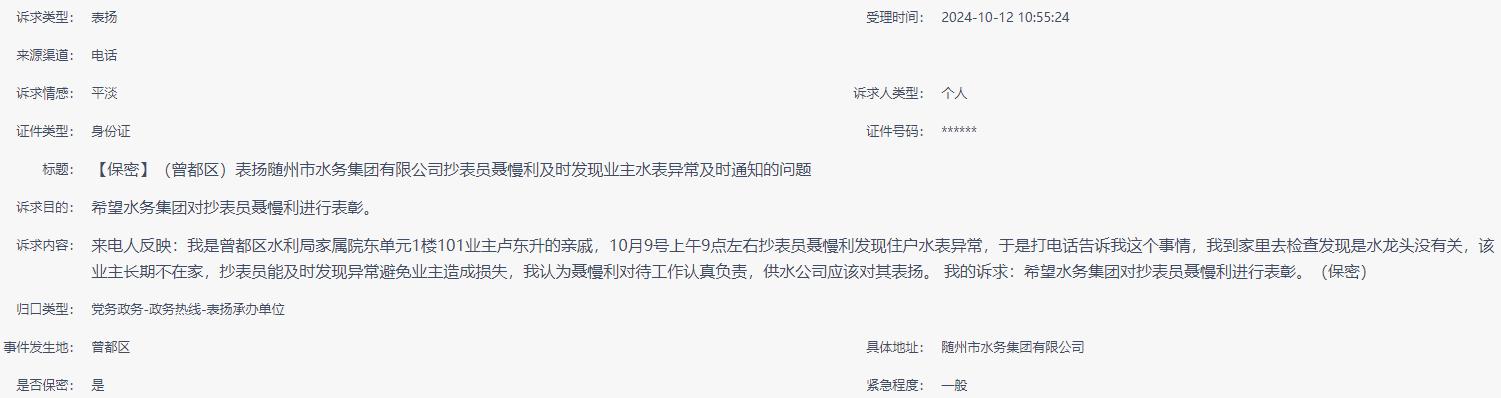 【保密】(曾都區(qū))表揚(yáng)隨州市水務(wù)集團(tuán)有限公司抄表員聶慢利及時發(fā)現(xiàn)業(yè)主水表異常及時通知的問題 |