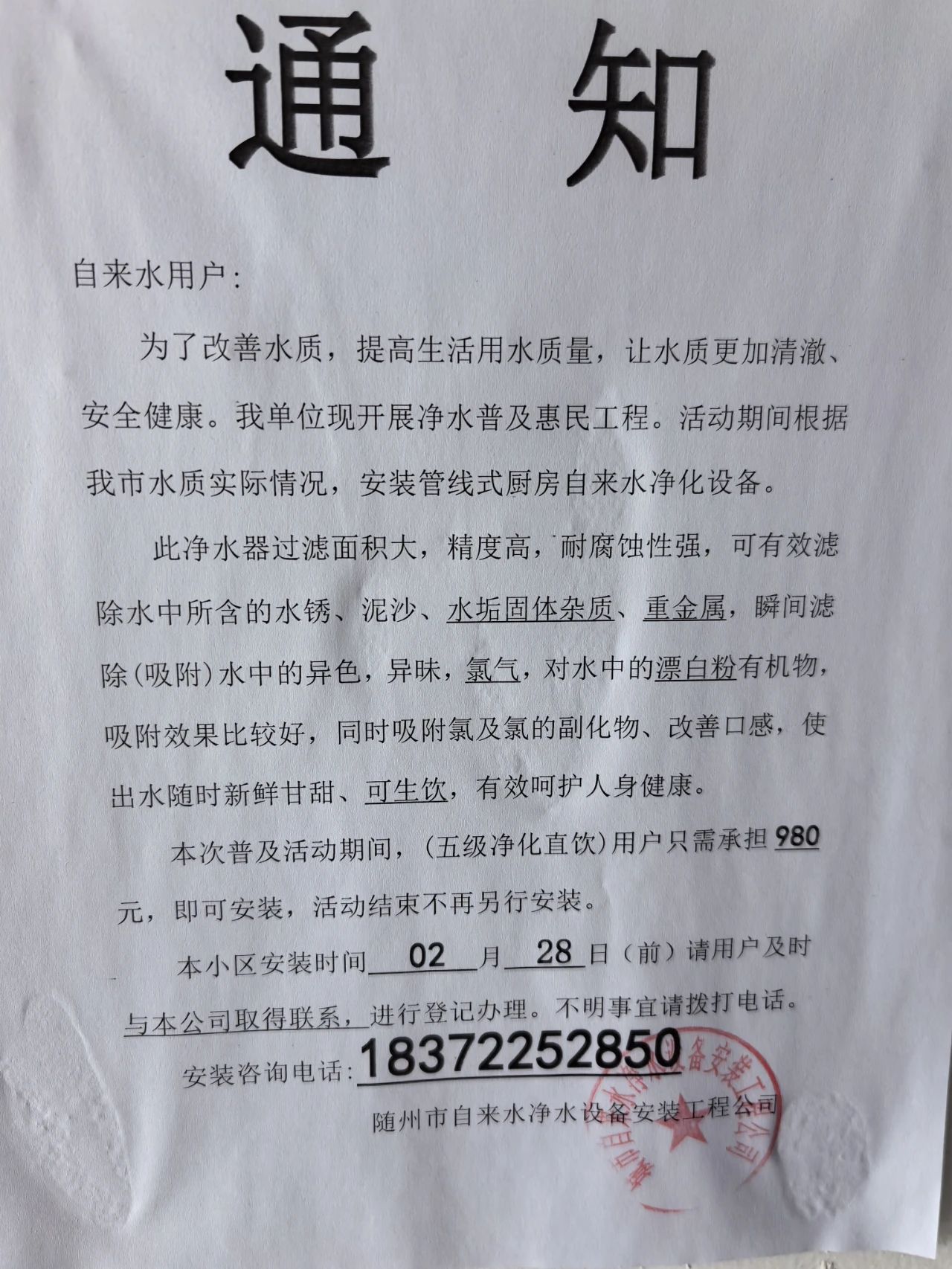 近期,我公司在隨州城區(qū)多個(gè)小區(qū)發(fā)現(xiàn)以“隨州市自來(lái)水凈水設(shè)備安裝工程公司”“隨州市二水自來(lái)水安裝工程有限公司”等公司名義張貼的《通知》。該行為打著改善自來(lái)水水質(zhì)的幌子,誤導(dǎo)自來(lái)水用戶(hù),推銷(xiāo)凈水設(shè)備,已造成惡劣影響?,F(xiàn)為維護(hù)我公司和廣大市民的合法權(quán)益,特鄭重聲明如下: