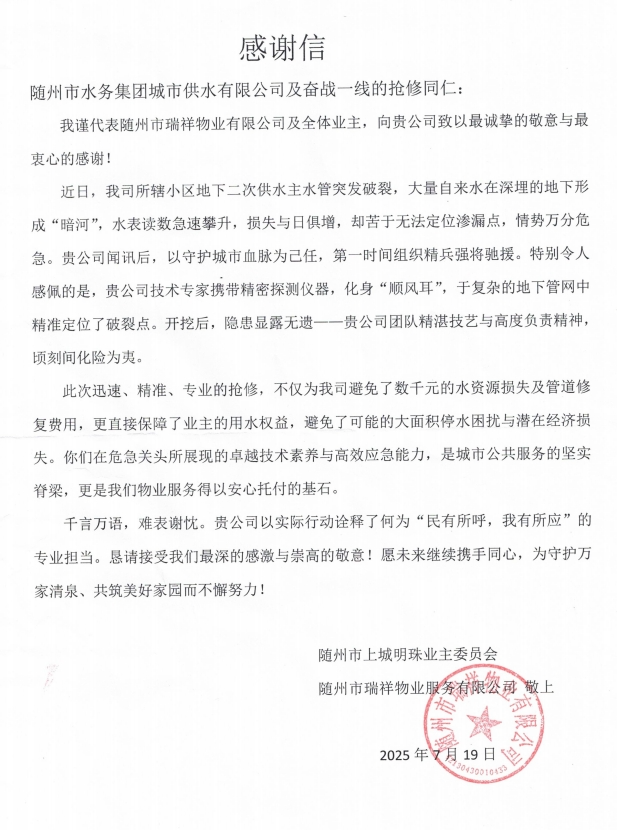 7月19日,上城明珠小區(qū)業(yè)委會(huì)與瑞祥物業(yè)的代表滿懷感激,將一面繡有“排憂解難、水域神探” 的錦旗和一封情真意切的感謝信送到城市供水公司,以此表達(dá)全體業(yè)主對(duì)城市供水公司的誠摯謝意。“若不是有你們團(tuán)隊(duì)的精湛技藝與高度負(fù)責(zé)精神,我們的損失不堪設(shè)想!這面錦旗雖輕,卻裝著全體業(yè)主的滿心感激!” 代表們緊握工作人員的手,話語間滿是動(dòng)容。